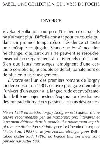 Viveka et Folke ont tout pour être heureux, mais ils ne s'aiment plus. Difficile constat pour ce couple qui dans un premier temps refuse l'évidence et tente une thérapie conjugale. Séance après séance rien ne change, d'autant qu'ils ne peuvent se résoudre, ensemble ou séparément, à se livrer tels qu'ils sont. Bien que leurs mensonges témoignent d'une certaine complicité, le couple se défait, banalement et de plus en plus sauvagement. Divorce est l'un des premiers romans de Torgny Lindgren. Ecrit en 1981, ce livre préfigure d'emblée l'univers d'un auteur à la langue rude et envoûtante, dont le thème majeur restera l'exploration des drames, des contradictions et des passions les plus dévorantes.