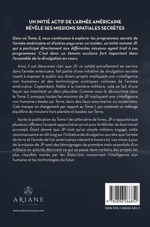 Dans ce tome II, nous continuons à explorer les programmes secrets de l’armée américaine et d’autres pays avec un insider, un initié nommé JP, qui a participé directement aux différentes missions ayant trait à ces programmes. C’est donc un témoin oculaire fort important dans l’ensemble de la divulgation en cours. Ainsi, il apparaît désormais clairement que JP, un soldat en service dans l’armée américaine, participe à une initiative de divulgation secrète visant à exposer le public à divers programmes impliquant une « intelligence non humaine » ainsi que des technologies exotiques connues de l’armée. Toutefois, conformément aux protocoles militaires, cette divulgation s’effectue de manière à préserver un déni plausible. Comme vous le découvrirez dans le Tome II, la quasi-totalité des missions de JP impliquent des intelligences non humaines basées sur Terre, opérant en particulier dans des lieux sous-marins ou souterrains. Après la publication du tome 1 de cette série de livres, JP a rapporté que plusieurs officiers l’avaient approché en privé pour le féliciter du bon travail accompli. Étant donné que JP n’est qu’un simple militaire engagé, cette reconnaissance en dit long sur l’initiative de divulgation secrète que l’armée de terre et l’armée de l’air américaines mènent à travers lui. Les mises à jour de la mission de JP sont des témoignages de première main essentiels d’un militaire en activité décrivant ce qui se passe dans certains des projets les plus classifiés menés par les Etats-Unis concernant l’intelligence non humaine et les technologies du futur.