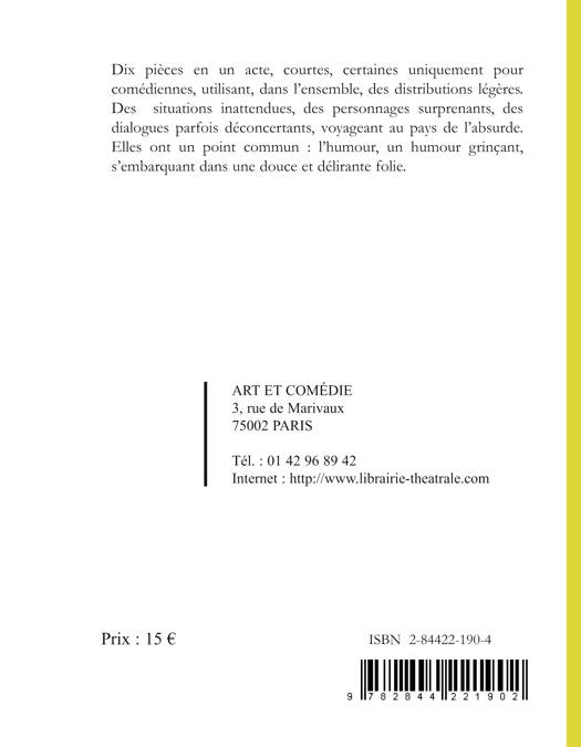 Dix pièces en un acte, courtes, certaines uniquement pour comédiennes, utilisant, dans l'ensemble, des distributions légères. Des situations inattendues, des personnages surprenants, des dialogues parfois déconcertants, voyageant au pays de l'absurde. Elles ont un point commun: l'humour, un humour grinçant, s'embarquant dans une douce et délirante folie.