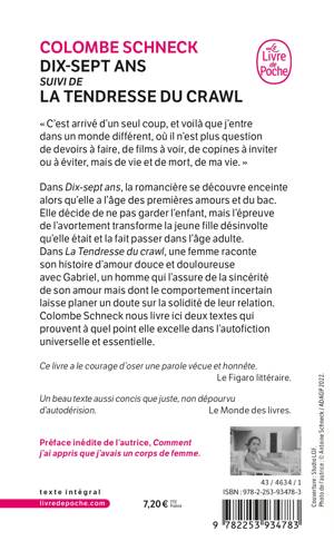 Dans Dix-sept ans, la romancière se découvre enceinte alors qu’elle a l’âge des premières amours et du bac. Elle décide de ne pas garder l’enfant, mais l’épreuve de l’avortement transforme la jeune fille désinvolte qu’elle était et la fait passer dans l’âge adulte.
