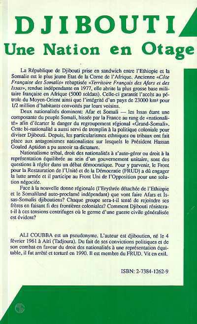Les particularités ethniques de Djibouti; les forces en présence sur le plan politique; les conditions de vie; les relations avec les pays colonisateurs, avec les pays voisins.