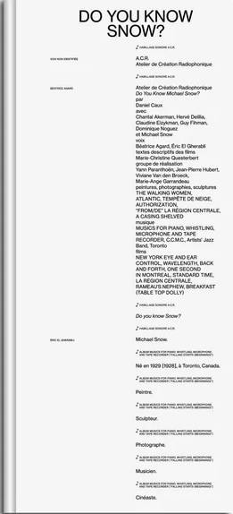 En 1978, Michael Snow (1928-2023) présente sa première exposition en France au Centre Georges-Pompidou à Paris, intitulée Michael Snow : Sept films et « Plus tard » (13 décembre 1978-29 janvier 1979). Parallèlement, il accepte l'invitation du musicologue français Daniel Caux (1940-2008) à participer à la réalisation de l'émission Do You Know Michael Snow ?, produite dans le cadre de l'Atelier de Création Radiophonique de Radio France et diffusée le 29 octobre 1978, un mois et demi avant le vernissage de l'exposition.