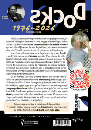 Doc(k)s, laboratoire expérimental des langages poétiques, est aujourd’hui la plus ancienne — créée en 1976 à Marseille par Julien Blaine —, et la dernière revue internationale de poésie vivante qui mixe les différentes formes de poésies expérimentales : Poésies Concrète, Visuelle, Sonore, Action/Performance et Numérique.Ancrée dans le territoire corse depuis près de 35 ans, Doc(k)s se définit comme un rhizome au sein d’un réseau de poétesses /poètes des cinq continents qui continuent à creuser le sillon de l’expérimentation poétique, dans le souci de libérer la poésie de tout ghetto, comme de l’accorder au monde contemporain et aux différents mediums qui le caractérisent et qu’ils pratiquent (écritures/graphies/images/vidéos/voix/sons/corps/électronique/numérique/web).Le 2e numéro (de cette 5e série) réunit un dossier spécial dédié au groupe intermédia corse Akenaton formé en 1984 par Philippe Castellin† & Jean Torregrosa, poètes-artistes & éditeurs de Doc(k)s de 1990 à 2022, ainsi qu’un chantier consacré au groupe “Language is a virus”, collectif international qui s’est créé en 2020 lors de la Covid-19 et qui continue de perdurer. Enfin, une partie Open propose les recherches/créations en cours d’environ cent-vingt poétesses/poètes-artistes de différentes générations/langues, d’univers novateurs et singuliers.Cet ouvrage constitue le catalogue de l'exposition“Doc(k)s : poésies underground” au Cipm (Centre international de poésie Marseille) du 28 mars au 13 juin 2026.