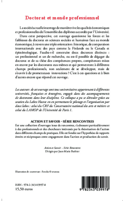 La société actuelle interroge de manière vive les qualités économiques et professionnelles de l'ensemble des diplômes accordés par l'Université. Dans cette perspective, cet ouvrage questionne les forces et les faiblesses du doctorat en sciences sociales et humaines face au monde économique, à travers une triple orientation : historique, de comparaison internationale avec des pays comme la Finlande ou le Canada et épistémologique.