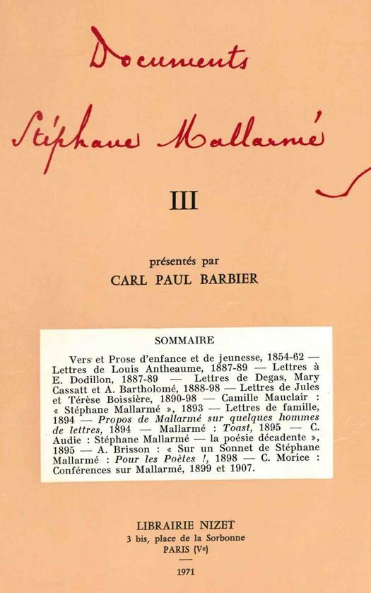 Dans cette troisième livraison des Documents Stéphane Mallarmé par Carl Paul Barbier, le lecteur trouvera des textes d'enfance ou de jeunesse (en vers ou en prose ) du poète, un grand nombre de lettres inédites, et quelques études mallarméennes datant de la fin du XIXe et du début du XXe siècle.