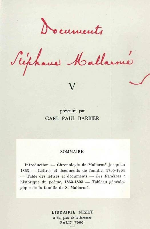 La plus grande partie de ce cinquieme tome des Documents Stephane Mallarme est consacree a la biographie et a la genealogie du poete. Les pieces innombrables ici reproduites et commentees, sont de toutes sortes: avis de naissance, de deces, de mariage, notes de bapteme, actes et contrats notaries, et bien sur lettres de famille. Celles-ci, debutant une bonne dizaine d'annees avant la naissance de Stephane Mallarme, nous livrent une connaissance intime et tres vaste de sa famille, la correspondance englobant des parents parfois fort eloignes. La periode debutant vers 1860 est particulierement interessante: on constate a quel point le jeune Stephane eut a souffrir de l'accueil decourageant que sa famille reserva a ses projets d'avenir, pas meme encore litteraires, mais de professeur d'anglais en universite ! D'ailleurs, le poeme Les Fenetres, ecrit en 1863, et dont Carl Paul Barbier retrace les avatars de ses publications successives, exprime toute l'amertume et la rancoeur du jeune homme envers une famille aimante certes, mais bien trop bourgeoise, bigote et conformiste pour comprendre une nature d'artiste (Ivre, il vit, oubliant l'horreur des saintes huiles/Les tisanes, l'horloge et le lit inflige...).