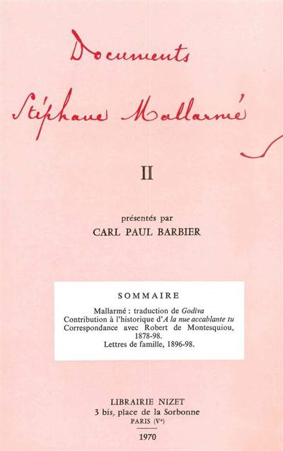 Ce second tome des Documents Stephane Mallarme revele le poete, le traducteur et surtout l'epistolier. A la nue accablante tu, ecrit en 1887 ou 1888 et publie en 1895, est l'une des compositions les plus difficiles de Mallarme. Ce sonnet a beaucoup alimente la polemique d'alors concernant la poesie des symbolistes en general, et celle de Mallarme en particulier. Quelques precisions relatives a l'historique de la publication du poeme controverse sont ici donnees. Mallarme, on le sait, a traduit plusieurs poetes anglo-saxons, notamment Edgar Allan Poe. La traduction qu'il donna de la celebre Godiva, poeme d'Alfred Tennyson (1809-1892), resta inedite jusqu'en 1970...Le brouillon de cette traduction, meticuleusement reproduit par Carl Paul Barbier, est donc bien precieux. Mais ce tome laisse la part belle a l'epistolier. On trouvera d'abord la correspondance (souvent pittoresque) avec Robert de Montesquiou, s'etalant sur vingt annees, puis le "morceau de choix" les lettres, si pleines d'affections, de charme (un ronronnement de chat) entre Mallarme et "ses Dames", sa femme et sa fille Genevieve. Echanges d'autant plus touchants qu'ils occupent les deux dernieres annees de la vie du poete. Une quinzaine de jours avant sa mort, le "Papa" ecrit a sa fille: "Un orage, que nous eussions retenu a pleins bras, a passe sur le pays (...) le travail de l'apres-midi a fondu"...
