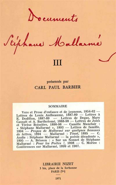 Dans cette troisième livraison des Documents Stéphane Mallarmé par Carl Paul Barbier, le lecteur trouvera des textes d'enfance ou de jeunesse (en vers ou en prose ) du poète, un grand nombre de lettres inédites, et quelques études mallarméennes datant de la fin du XIXe et du début du XXe siècle.