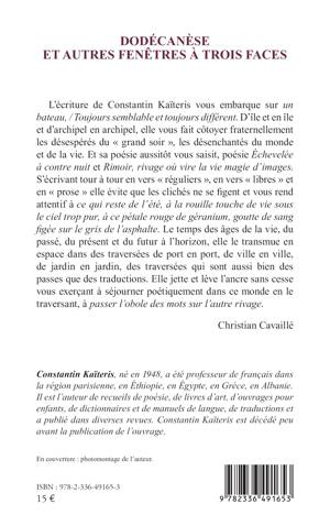 L’écriture de Constantin Kaïteris vous embarque sur un bateau, / Toujours semblable et toujours différent. D’île et en île et d’archipel en archipel, elle vous fait côtoyer fraternellement les désespérés du « grand soir », les désenchantés du monde et de la vie. Et sa poésie aussitôt vous saisit, poésie Échevelée à contre nuit et Rimoir, rivage où vire la vie magie d’images. S’écrivant tour à tour en vers « réguliers », en vers « libres » et en « prose » elle évite que les clichés ne se figent et vous rend attentif à ce qui reste de l’été, à la rouille touche de vie sous le ciel trop pur, à ce pétale rouge de géranium, goutte de sang figée sur le gris de l’asphalte. Le temps des âges de la vie, du passé, du présent et du futur à l’horizon, elle le transmue en espace dans des traversées de port en port, de ville en ville, de jardin en jardin, des traversées qui sont aussi bien des passes que des traductions. Elle jette et lève l’ancre sans cesse vous exerçant à séjourner poétiquement dans ce monde en le traversant, à passer l’obole des mots sur l’autre rivage. Christian Cavaillé