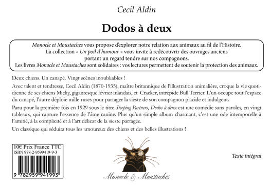 Deux chiens. Un canapé. Vingt scènes inoubliables ! Avec talent et tendresse, Cecil Aldin (1870-1935), maître britannique de l’illustration animalière, croque la vie quotidienne de ses chiens Micky, gigantesque lévrier irlandais, et Cracker, intrépide Bull Terrier. L’un occupe tout l’espace du canapé, l’autre déploie mille ruses pour partager la sieste de son compagnon placide et indulgent. Paru pour la première fois en 1929 sous le titre "Sleeping Partners", Dodos à deux est une comédie sans paroles, en vingt tableaux, qui capture l’essence de l’âme canine. Plus qu’un simple album charmant, c’est une ode intemporelle à l’amitié, à la complicité et à l’art délicat de la sieste partagée. Un classique qui séduira tous les amoureux des chiens et des belles illustrations !