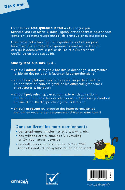 Des textes adaptés pour lire plus facilement ! Pour faciliter l’apprentissage de la lecture, les mots qui composent les histoires ont été sélectionnés en fonction de leur familiarité, de leur structure syllabique et des graphèmes* qu’ils contiennent. Plusieurs adaptations visuelles permettent de réduire la charge cognitive liée au décodage et de limiter l’encombrement perceptif. Les livrets contiennent deux fois la même histoire : dans la première version, syllabes orales, lettres muettes et graphèmes complexes sont mis en relief ; dans la seconde, ces adaptations ne sont pas présentes. Ce sont donc des outils polyvalents qui favorisent le transfert des acquis et qui conviennent à tous les enfants. Les histoires fantaisistes mettent en scène des personnages rigolos et attachants. La trame narrative captive les jeunes lecteurs tout en leur permettant de faire des prédictions. Les illustrations leur donnent aussi de nombreuses occasions de faire des inférences.