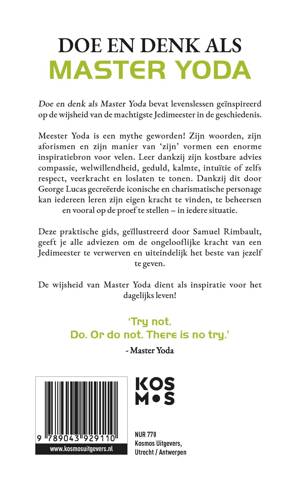 Doen en denken als Meester Yoda is wijsheid, kracht maar ook goedheid verwerven en loslaten. Het iconische en charismatische personage, bekend van Star Wars, dient als inspiratie voor het dagelijks leven. Zo is dit boek gevuld met informatie over hoe je kunt leren van de kalmte, kracht en wijze van de meester, met onder andere levenslessen en korte citaten van Meester Yoda, en andere schrijvers. Daarnaast kun je doormiddel van een PSF test, erachter komen wat jouw Persoonlijke force score is, en is het boek gevuld met tips van boeken en films om verder mee op weg te gaan!