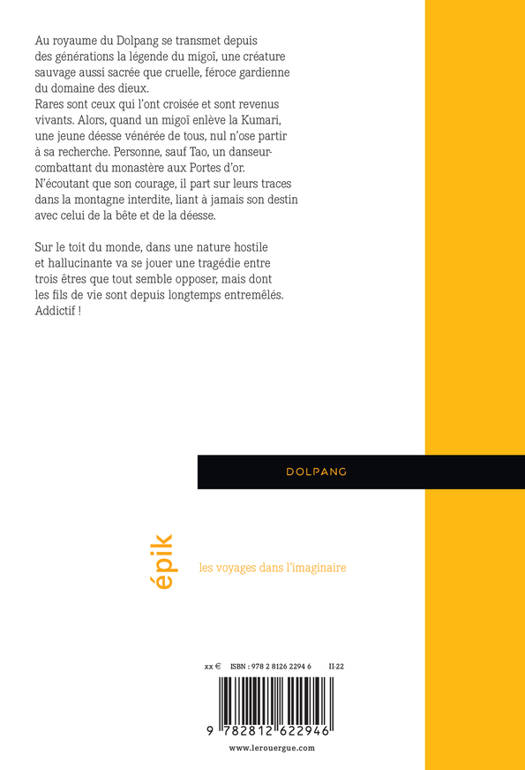 Depuis des générations se transmet la légende du migoï, le yéti, aussi sacré que cruel. Au royaume du Dolpang, rares sont ceux qui l'ont croisé et en sont revenus vivants. Alors, quand un migoï enlève la Kumari, la jeune déesse vénérée de tous, nul ne sait comment la retrouver. Personne, sauf Tao, un Danseur-Combattant du Monastère aux Portes d'Or. Seul, il part sur ses traces et lie à jamais son destin avec celui de la bête. Tragédie polyphonique imprégnée de culture et légendes népalaises, roman fantastique au milieu des montagnes du toit du monde, Dolpang tord la réalité de l'Himalaya pour mieux nous y transporter, addictif !