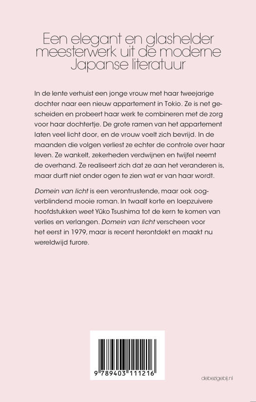 Domein van licht is een verontrustende, maar ook oogverblindend mooie roman. In twaalf korte en loepzuivere hoofdstukken weet Yuko Tsushima tot de kern te komen van verlies en verlangen. Domein van licht verscheen voor het eerst in 1979, maar is recent herontdekt en maakt nu wereldwijd furore.