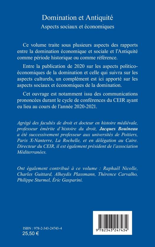 Ce volume traite sous plusieurs aspects des rapports entre la domination économique et sociale et l’Antiquité comme période historique ou comme référence. Entre la publication de 2020 sur les aspects politico-économiques de la domination et celle qui suivra sur les aspects culturels, un complément est ici apporté sur les aspects sociaux et économiques de la domination. Cet ouvrage est notamment issu des communications prononcées durant le cycle de conférences du CEIR ayant eu lieu au cours de l’année 2020-2021.