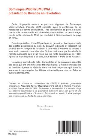 Cette biographie retrace le parcours atypique de Dominique Mbonyumutwa. Très tôt orphelin de père, il devint, par sa lutte remarquable aux côtés des plus humbles, un personnage clé de la Révolution de 1959 qui conduisit à l’indépendance du pays en 1962. Premier président d’une République en gestation, il occupa ensuite des postes prestigieux au sein du pouvoir judiciaire et législatif. Sa probité et son intégrité le forcèrent à une rude traversée du désert. Après sa mort inopinée à 65 ans, il fut déclaré « Père de la Nation ». L’ouvrage fourmille de faits, d’anecdotes et de souvenirs racontés par ceux qui ont cheminé avec Mbonyumutwa. L’histoire individuelle et familiale épouse la Grande dans ce livre qui invite la jeunesse à s’approprier les idéaux démocratiques pour en faire sa culture permanente.