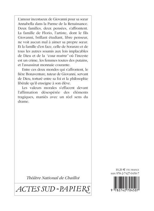 L'amour incestueux de Giovanni pour sa soeur Annabella dans la Parme de la Renaissance. Les valeurs morales s'effacent devant l'affirmation désespérée des éléments tragiques maniés avec un réel sens du drame.