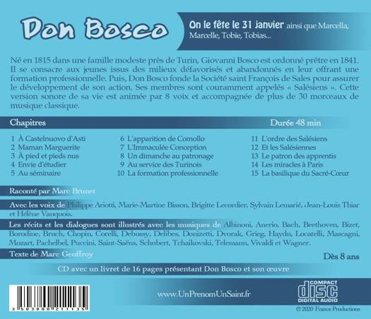 Conté par des acteurs et illustré par des musiques classiques, le récit de la vie de Don Bosco fait évoluer l'enfant dans l'univers de ce saint exemplaire. Cette version sonore de la vie de Don Bosco est animée par 10 voix et accompagnée de plus de trente morceaux de musique classique. Né en 1815 près de Turin dans une famille modeste, Giovanni Bosco est ordonné prêtre en 1841. Il se consacre aux jeunes issus des milieux défavorisés et abandonnés en leur offrant une formation professionnelle. Puis, Don Bosco fonde la Société saint François de Sales pour assurer le développement de son action. Ses membres sont couramment appelés « Salésiens ». Cette version sonore de sa vie est animée par 10 voix et accompagnée de plus de 30 morceaux de musique classique.