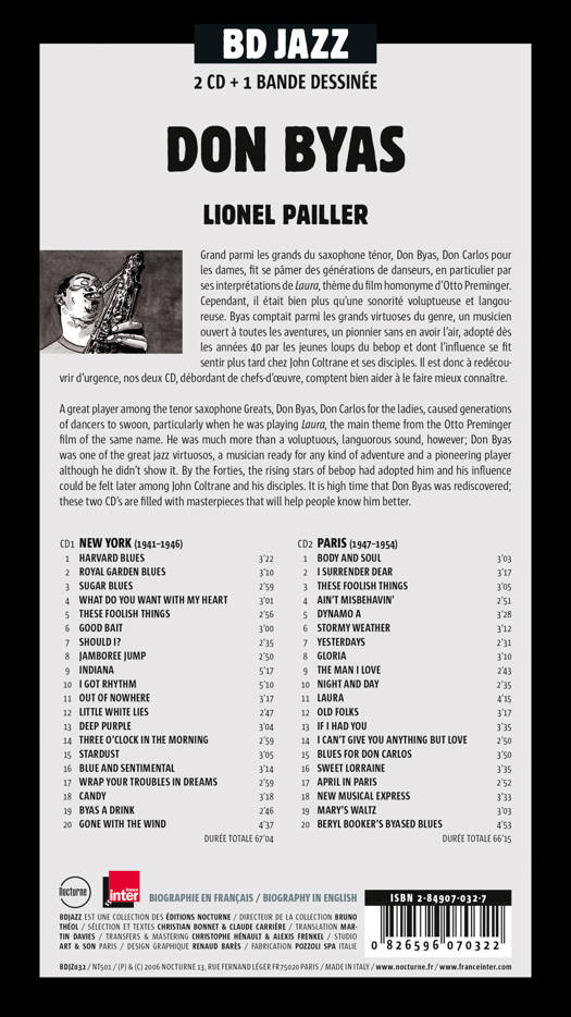 Grand parmi les grands du saxophone ténor, Don Byas, Don Carlos pour les dames, fit se pâmer des générations<br /> de danseurs, en particulier par ses interprétations de Laura, thème du film homonyme d’Otto Preminger.<br /> Cependant, il était bien plus qu’une sonorité voluptueuse et langoureuse. Byas comptait parmi les grands virtuoses<br /> du genre, un musicien ouvert à toutes les aventures, un pionnier sans en avoir l’air, adopté dès les années 40 par<br /> les jeunes loups du bebop et dont l’influence se fit sentir plus tard chez John Coltrane et ses disciples. Il est donc à<br /> redécouvrir d’urgence, nos deux CD, débordant de chefs-d’oeuvre, comptent bien aider à le faire mieux connaître.