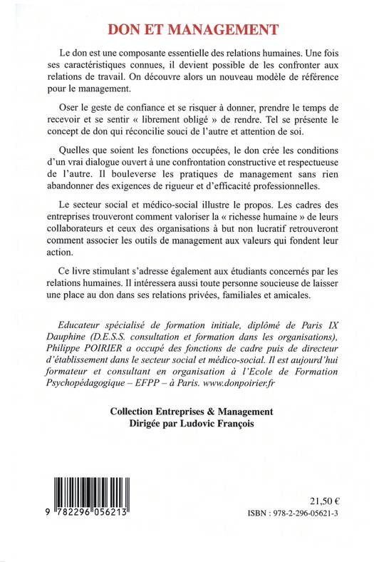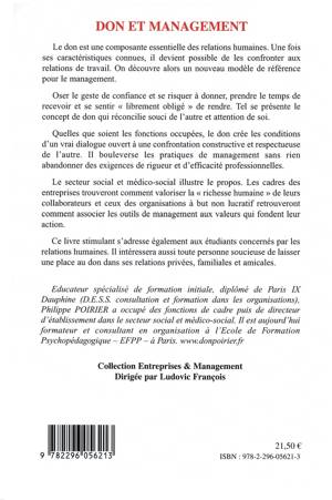 Le don est une composante essentielle des relations humaines. Appliqué aux relations de travail, il crée les conditions d'un vrai dialogue ouvert à une confrontation constructive et respectueuse de l'autre. Il bouleverse les pratiques du management sans abandonner exigences de rigueur et efficacité professionnelles. Le secteur social et médico-social illustre le propos. Les cadres des entreprises trouveront comment valoriser la "richesse humaine" de leurs collaborateurs et ceux des organisations à but non lucratif retrouveront comment associer les outils de management aux valeurs qui fondent leur action.