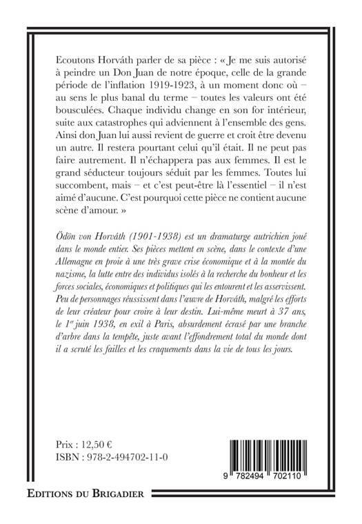 Ecoutons Horvath parler de sa pièce : "Je me suis autorisé à peindre un Don Juan de notre époque, celle de la grande période de l'inflation 1919-1923, à un moment donc où, au sens le plus banal du terme, toutes les valeurs ont été bousculées. Chaque individu change en son for intérieur, suite aux catastrophes qui adviennent à l'ensemble des gens. Ainsi, Don Juan lui aussi revient de guerre et croit être devenu un autre. Il restera pourtant celui qu'il était. Il ne peut pas faire autrement. Il n'échappera pas aux femmes. Il est le grand séducteur toujours séduit par les femmes. Toutes lui succombent, mais - et c'est peut-être là l'essentiel - il n'est aimé d'aucune. C'est pourquoi cette pièce ne contient aucune scène d'amour."