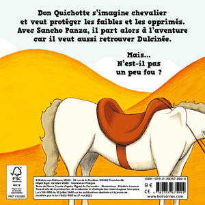 Un gentilhomme a lu tellement de livres de chevalerie qu'il en perd l'esprit. Il se nomme maintenant Don Quichotte et part à l'aventure avec un laboureur, Sancho Panza. Ils rencontreront des géants, à moins que ce ne soient des moulins à vent, et des armées en bataille, sauf si ce n'étaient que des troupeaux de moutons⦠Certains tenteront de l'aider, d'autres se moqueront de lui, mais Don Quichotte finira par retrouver la raison, entouré de ses amis. D'après le célèbre roman de Miguel de Cervantes, les tout-petits suivront les aventures de Don Quichotte, de manière adaptée, simple, et en même temps les parents pourront aussi (re)découvrir ce classique intemporel.