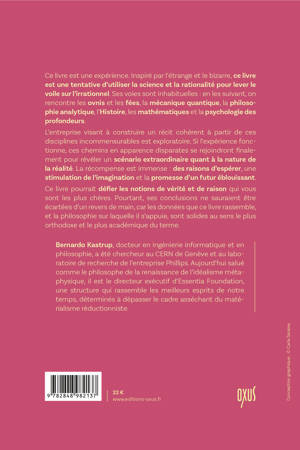 Ce livre est une expérience. Inspiré par l’étrange et le bizarre, ce livre est une tentative d’utiliser la science et la rationalité pour lever le voile sur l’irrationnel. Ses voies sont inhabituelles : en les suivant, on rencontre les ovnis et les fées, la mécanique quantique, la philosophie analytique, l’Histoire, les mathématiques et la psychologie des profondeurs. L’entreprise visant à construire un récit cohérent à partir de ces disciplines incommensurables est exploratoire. Si l’expérience fonctionne, ces chemins en apparence disparates se rejoindront finalement pour révéler un scénario extraordinaire quant à la nature de la réalité. La récompense est immense : des raisons d’espérer, une stimulation de l’imagination et la promesse d’un futur éblouissant. Ce livre pourrait défier les notions de vérité et de raison qui vous sont les plus chères. Pourtant, ses conclusions ne sauraient être écartées d’un revers de main, car les données que ce livre rassemble, et la philosophie sur laquelle il s’appuie, sont solides au sens le plus orthodoxe et le plus académique du terme.