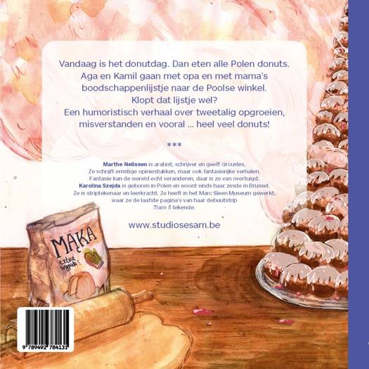 Morgen is het donutdag, een Poolse feestdag. Aga en Kamil gaan met opa en met mama's boodschappenlijstje naar de Poolse winkel. Klopt dat lijstje wel? Wat willen de vreemde woorden zeggen op de verpakkingen in de winkel? En wat zijn donuts lekker!
