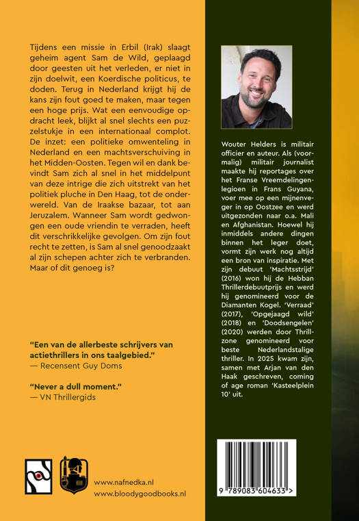 Tijdens een missie in Erbil (Irak) slaagt geheim agent Sam de Wild, geplaagd door geesten uit het verleden, er niet in zijn doelwit, een Koerdische politicus, te doden. Terug in Nederland krijgt hij de kans zijn fout goed te maken, maar tegen een hoge prijs. Wat een eenvoudige opdracht leek, blijkt al snel slechts een puzzelstukje in een internationaal complot. De inzet: een politieke omwenteling in Nederland en een machtsverschuiving in het Midden-Oosten. Tegen wil en dank bevindt Sam zich al snel in het middelpunt van deze intrige die zich uitstrekt van het politiek pluche in Den Haag, tot de onderwereld. Van de Iraakse bazaar, tot aan Jeruzalem. Wanneer Sam wordt gedwongen een oude vriendin te verraden, heeft dit verschrikkelijke gevolgen. Om zijn fout recht te zetten, is Sam al snel genoodzaakt al zijn schepen achter zich te verbranden. Maar of dit genoeg is?