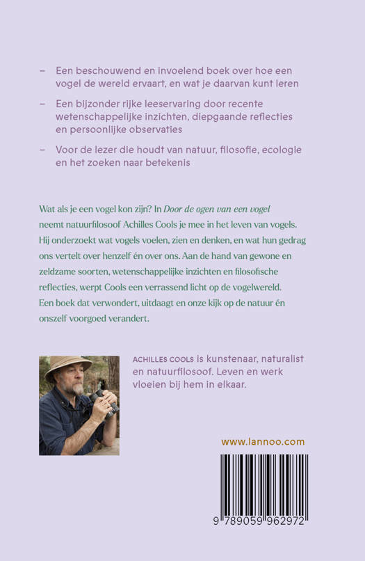 Wat als je een vogel kon zijn? In Door de ogen van een vogel neemt natuurfilosoof Achilles Cools je mee in het leven van vogels. Hij onderzoekt wat vogels voelen, zien en denken, en wat hun gedrag ons vertelt over henzelf én over ons. Aan de hand van gewone en zeldzame soorten, wetenschappelijke inzichten en filosofische reflecties, werpt Cools een verrassend licht op de vogelwereld. Een boek dat verwondert, uitdaagt en onze kijk op de natuur én onszelf voorgoed verandert.