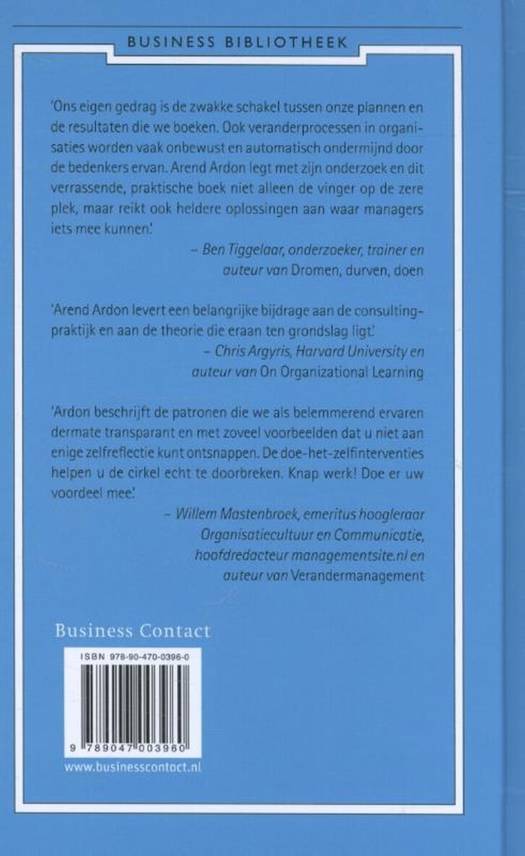 De meeste managers hebben tegenwoordig veel kennis over verandermanagement. Toch loopt het in de praktijk nogal eens spaak. Dat komt omdat onze kennis maar zeer beperkt ons handelen stuurt. Zonder dat we het weten hebben wij aannames over onze medewerkers die ons juist in de problemen brengen. En onbewust vertonen we gedrag waarmee we initiatief en verantwoordelijkheidsgevoel van medewerkers ondermijnen. Om de taaie situaties die hieruit ontstaan te doorbreken, moet je begrijpen hoe je die als manager zelf in stand houdt. Arend Ardon maakt glashelder hoe ze ontstaan en biedt doe-hetzelfinterventies om de verandering weer vlot te trekken. Dankzij zijn observaties van vele directieteams, managementteams en managers met hun medewerkers maakt hij haarfijn zichtbaar wat er echt gebeurt terwijl we praten over verandering.