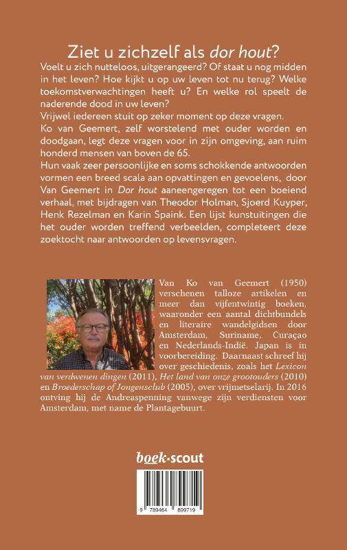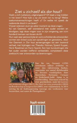 Hun vaak zeer persoonlijke en soms schokkende antwoorden vormen een breed scala aan opvattingen en gevoelens, door Van Geemert in Dor hout aaneengeregen tot een boeiend verhaal, met bijdragen van Theodor Holman, Sjoerd Kuyper, Henk Rezelman en Karin Spaink. Een lijst kunstuitingen die het ouder worden treffend verbeelden, completeert deze zoektocht naar antwoorden op levensvragen.