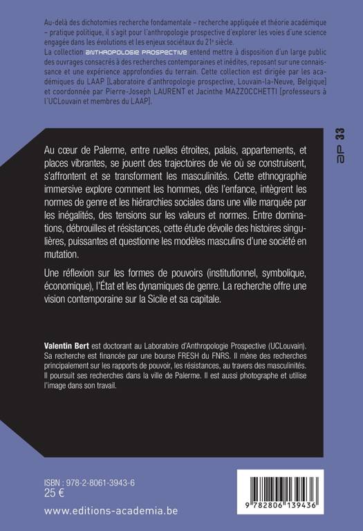 Au coeur de Palerme, entre ruelles étroites, palais, appartements, et places vibrantes, se jouent des trajectoires de vie où se construisent, s'affrontent et se transforment les masculinités. Cette ethnographie immersive explore comment les hommes, dès l'enfance, intègrent les normes de genre et les hiérarchies sociales dans une ville marquée par les inégalités, des tensions sur les valeurs et normes. Entre dominations, débrouilles et résistances, cette étude dévoile des histoires singulières, puissantes et questionne les modèles masculins d'une société en mutation. Une réflexion sur les formes de pouvoirs (institutionnel, symbolique, économique), l'État et les dynamiques de genre. La recherche offre une vision contemporaine sur la Sicile et sa capitale.