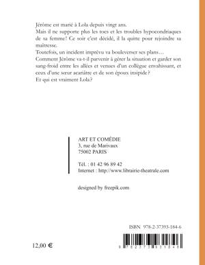 Jérôme est marié à Lola depuis vingt ans. Mais il ne supporte plus les tocs et les troubles hypocondriaques de sa femme ! Ce soir c'est décidé, il la quitte pour rejoindre sa maîtresse. Toutefois, un incident imprévu va bouleverser ses plans... Comment Jérôme va-t-il parvenir à gérer la situation et garder son sang-froid entre les allées et venues d'un collègue envahissant, et ceux d'une soeur acariâtre et de son époux insipide ? Et qui est vraiment Lola ?