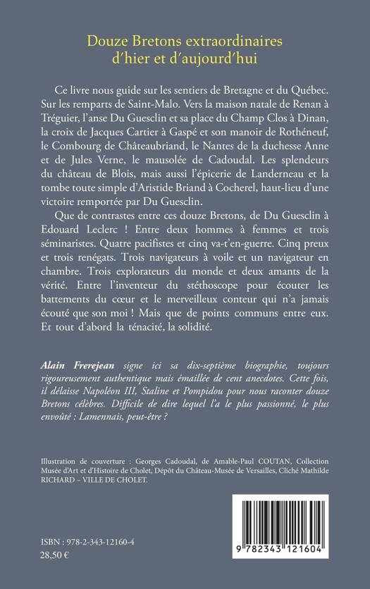 Ce livre nous guide sur les sentiers de Bretagne et du Québec. Sur les remparts de Saint-Malo, vers la maison natale de Renan à Tréguier, l'anse Du Guesclin et sa place du Champ Clos à Dinan, la croix de Jacques Cartier à Gaspé et son manoir de Rothéneuf, le Combourg de Châteaubriand, le Nantes de la duchesse Anne et de Jules Verne, le mausolée de Cadoudal L'auteur nous raconte douze Bretons célèbres, sans omettre Edouard Leclerc. Difficile de dire lequel l'a le plus passionné : Lamenais peut-être ?