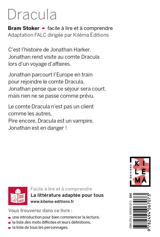 UN LIVRE FACILE À LIRE ET À COMPRENDRE C’est l’histoire de Jonathan Hacker. Jonathan rend visite au comte Dracula lors d’un voyage d’affaires. Jonathan parcourt l’Europe en train pour rejoindre le comte Dracula. Jonathan pense que ce séjour sera court, mais rien ne se passe comme prévu. Le comte Dracula n’est pas un client comme les autres. Pire encore, Dracula est un vampire. Jonathan est en dangerâ! (Re)découvrez ce grand classique de la littérature de genre, adapté en FALC pour qu'il soit accessible à tous.