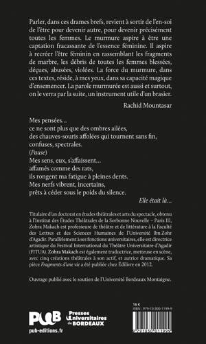 Parler, dans ces drames brefs, revient à sortir de l’en-soi de l’être pour devenir autre, pour devenir précisément toutes les femmes. Le murmure aspire à être une captation fracassante de l’essence féminine. Il aspire à recréer l’être féminin en rassemblant les fragments de marbre, les débris de toutes les femmes blessées, déçues, abusées, violées. La force du murmure, dans ces textes, réside, à mes yeux, dans sa capacité magique d’ensemencer. La parole murmurée est aussi et surtout, on le verra par la suite, un instrument utile d’un brasier.