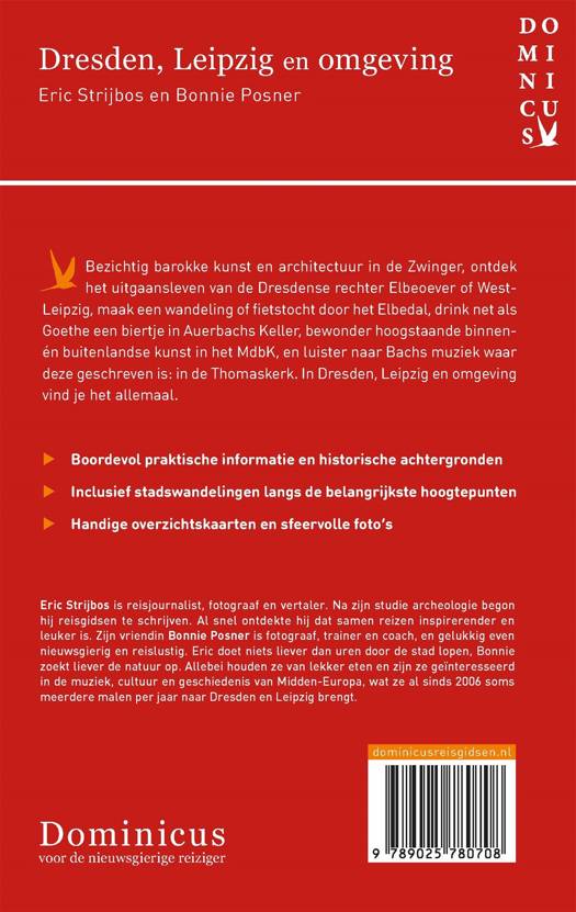 Ontdek Dresden, Leipzig en omgeving op vakantie in Duitsland met deze Dominicus-reisgids en verken twee bruisende steden en de prachtige, rijke natuurgebieden eromheen. Bezoek Dresden en ontdek het bruisende uitgaansleven, het sfeervolle stadscentrum en beklim de Frauenkirche voor het mooie uitzicht over de stad. Vergaap je aan het Brühlsche Terras, de meest romantische plek in Dresden waar je uitkijkt op de Elbevallei. Verblijf in Leipzig en bezoek de Panoramatoren in het hart van de stad of bezoek een van de bekendste kerken van Leipzig, de Nicolaaskerk. Deze reisgids zit boordevol praktische informatie, historische achtergronden, handige overzichtskaarten, sfeervolle foto's en uitgebreide culturele achtergrondinformatie. Bovendien zijn Dominicus-reisgidsen altijd up-to-date en geschreven door Nederlandstalige experts. Eric Strijbos is reisjournalist, fotograaf en vertaler, Bonnie Posner is fotograaf en trainer-coach. Samen hebben ze diverse Dominicusgidsen geschreven en zijn ze al meer dan vijftien jaar in alle seizoenen in Dresden en Leipzig te vinden.
