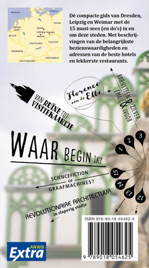 Drie prachtige steden in de vroegere DDR. Dresden is de barokstad bij uitstek, Leipzig kent een ongelooflijke muziekgeschiedenis en in Weimar liet schrijver Goethe tal van sporen na. Van een trip naar dit drietal kun je bovendien gemakkelijk een Bauhaus-ontdekkingsreis maken met het schitterende Bauhausgebouw in Dessau als hoogtepunt. Deze ANWB Extra reisgids biedt behalve veel praktische tips over hotels, restaurants en winkels 15 niet te missen bezienswaardigheden. Bewonder de fantastische kunstcollecties in de Zwinger en het Residenzschloss in Dresden, geniet van een Bachconcert in Leipzig, dompel je onder in de trendy buitenwijk Plagwitz in Leipzig of vaar met een ouderwetse stoomboot vanuit Dresden naar het romantische natuurgebied de Sächsische Schweiz. Deze kleine reisgids past gemakkelijk in de tas en heeft een handige uitneembare kaart.