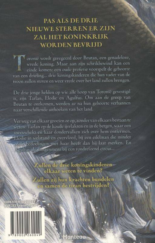 PAS ALS DE DRIE NIEUWE STERREN ER ZIJN ZAL HET KONINKRIJK WORDEN BEVRIJD Toronië wordt geregeerd door Brutan, een genadeloze, wrede koning. Maar aan zijn schrikbewind kan een einde komen: een oude profetie voorspelt de geboorte van een drieling... drie koningskinderen die hun vader van de troon zullen stoten en weer vrede over het land zullen brengen. De drie jonge helden op wie alle hoop van Toronië gevestigd is, zijn Tarlan, Elodie en Agulfus. Om aan de greep van Brutan te ontkomen, worden ze na hun geboorte verbannen naar verschillende uithoeken van het land. Ver weg van elkaar groeien ze op, zonder van elkaars bestaan te weten: Tarlan op de koude ijsvlakten en in de bergen, waar een sneeuwheks en haar dondervalken zich over hem ontfermen. Elodie in welstand en overvloed, bij een edelman die minder edele bedoelingen met haar heeft dan hij laat merken. En Agulfus als slangenmens bij een rondreizend circus... Zullen de drie koningskinderen elkaar weten te vinden? Zullen zij hun krachten bundelen en samen de tiran bestrijden?