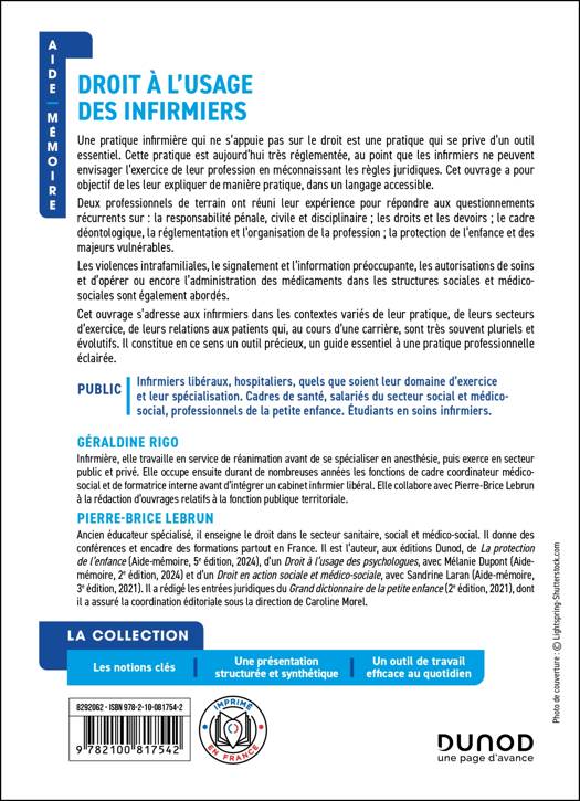 Deux professionnels de terrain ont réuni leur expérience pour répondre aux questionnements récurrents sur : la responsabilité pénale, civile et disciplinaire ; les droits et les devoirs ; le cadre déontologique, la réglementation et l’organisation de la profession ; la protection de l’enfance et des majeurs vulnérables.