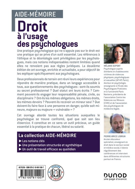Deux professionnels de terrain ont réuni leurs expériences pour répondre de manière pratique, dans un langage accessible à tous, aux questionnements des psychologues : sont-ils soumis au secret professionnel ? Quel statut ont leurs écrits ? Comment peuvent-ils engager leur responsabilité pénale, civile, ou disciplinaire ? Ont-ils les mêmes obligations, les mêmes droits, les mêmes devoirs ? Peuvent-ils recevoir un mineur seul ? Que doivent-ils faire face à une personne en danger, qu’elle soit mineure, majeure ou majeure « vulnérable » ?