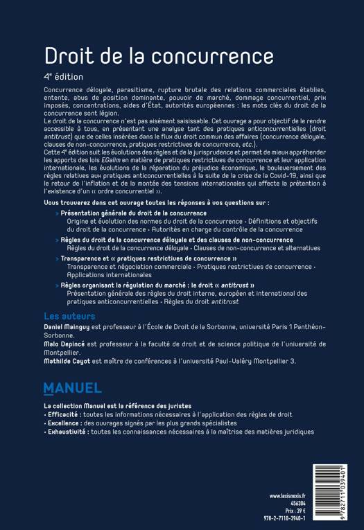 Le droit de la concurrence est difficile à saisir, rassemblant des règles au sens classique et un ensemble de procédures appliquées à des situations de concurrence ou de non concurrence. Il utilise un vocabulaire économique peu ordinaire. Au « grand » droit de la concurrence, que nous appelons « droit antitrust », d'application rare, correspondent les autres ensembles plus fréquents de concurrence déloyale, pratiques restrictives, clauses de non-concurrence... Cet ouvrage traite de tous ces aspects à travers un plan délibérément didactique et progressif.