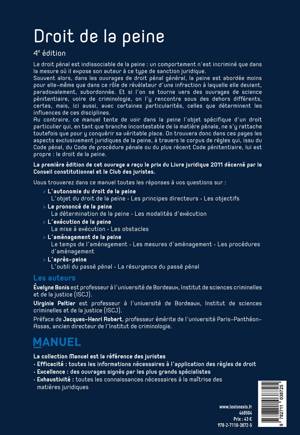 Partie 1 : L'autonomie du droit de la peine Titre 1 : L'objet du droit de la peine Titre 2 : les principes directeurs du droit de la peine Partie 2 : Le prononcé de la peine Titre 1 : La détermination de la peine Titre 2 : Les modalités d'exécution de la peine Titre 3 : l'inexécution de la peine Partie 3 : L'aménagement de la peine Titre 1 : les modalités procédurales d'aménagement de la peine Titre 2 : Les mesures d'aménagement de la peine Partie 4 : L'après-peine Titre 1 : L'oubli du passé pénal Titre 2 : La résurgence du passé pénal