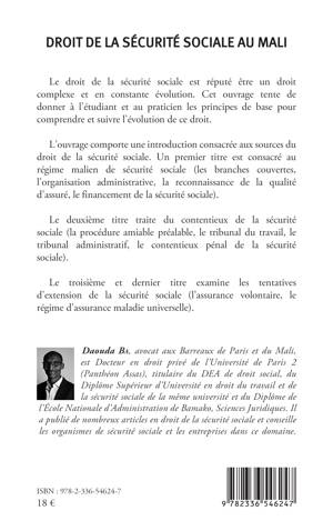 Le droit de la sécurité sociale est réputé être un droit complexe et en constante évolution. Cet ouvrage tente de donner à l'étudiant et au praticien les principes de base pour comprendre et suivre l'évolution de ce droit. L'ouvrage comporte une introduction consacrée aux sources du droit de la sécurité sociale. Un premier titre est consacré au régime malien de sécurité sociale (les branches couvertes, l'organisation administrative, la reconnaissance de la qualité d'assuré, le financement de la sécurité sociale). Le deuxième titre traite du contentieux de la sécurité sociale (la procédure amiable préalable, le tribunal du travail, le tribunal administratif, le contentieux pénal de la sécurité sociale). Le troisième et dernier titre examine les tentatives d'extension de la sécurité sociale (l'assurance volontaire, le régime d'assurance maladie universelle).