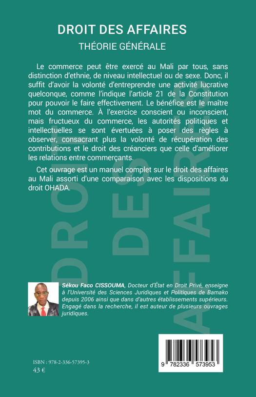 Le commerce peut être exercé au Mali par tous, sans distinction d'ethnie, de niveau intellectuel ou de sexe. Donc, il suffit d'avoir la volonté d'entreprendre une activité lucrative quelconque, comme l'indique l'article 21 de la Constitution pour pouvoir le faire effectivement. Le bénéfice est le maître mot du commerce. À l'exercice conscient ou inconscient, mais fructueux du commerce, les autorités politiques et intellectuelles se sont évertuées à poser des règles à observer, consacrant plus la volonté de récupération des contributions et le droit des créanciers que celle d'améliorer les relations entre commerçants. Cet ouvrage est un manuel complet sur le droit des affaires au Mali assorti d'une comparaison avec les dispositions du droit OHADA.