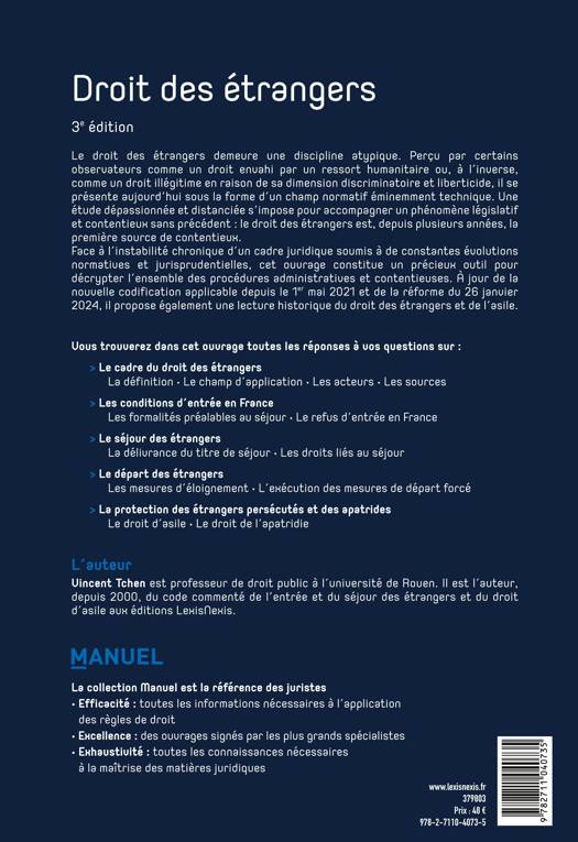 Points forts de l'ouvrage : 1/ Tous les aspects du droit des étrangers appréhendés en un seul ouvrage : droit de l'entrée, du séjour et du départ forcé des étrangers et droit de la protection. 2/ Contexte très particulier de renouvellement du droit des étrangers et de recodification (2021). Ce manuel permet d'accompagner ces changements.