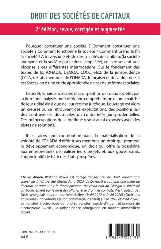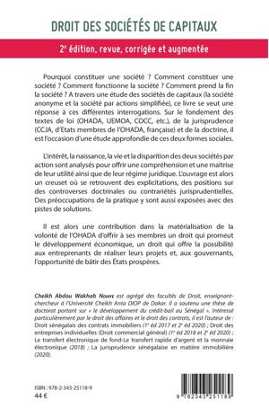 Pourquoi constituer une société ? Comment constituer une société ? Comment fonctionne la société ? Comment prend fin la société ? A travers une étude des sociétés de capitaux (la société anonyme et la société par actions simplifiée), ce livre se veut une réponse à ces différentes interrogations. Sur le fondement des textes de loi (OHADA, UEMOA, COCC, etc.), de la jurisprudence (CCJA, d'Etats membres de l'OHADA, française) et de la doctrine, il est l'occasion d'une étude approfondie de ces deux formes sociales.