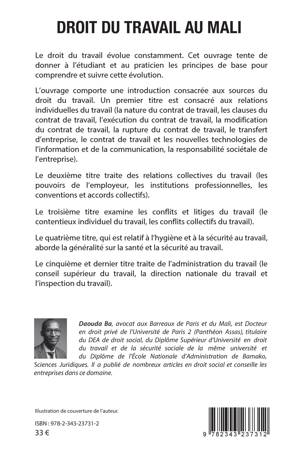L'ouvrage comporte une introduction consacrée aux sources du droit du travail. Un premier titre est consacré aux relations individuelles du travail (relatif au contrat de travail sous toutes ses formes). Le deuxième titre traite des relations collectives du travail. Le troisième titre examine les conflits et litiges du travail. Le quatrième titre aborde la généralité sur la santé et la sécurité au travail et dernier titre traite de l'administration du travail (le conseil supérieur du travail, la direction nationale du travail et l'inspection du travail).