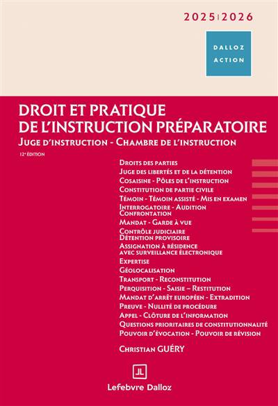 Magistrats instructeurs, avocats, juges des libertés et de la détention, membres du ministère public, magistrats des chambres de l'instruction trouveront dans cet ouvrage à jour de la loi du 20 novembre 2023 d'orientation et de programmation du ministère de la Justice, de la loi du 22 avril 2024 dans ses dispositions relatives au mandat d'arrêt européen, de la loi du 26 novembre 2024 visant à sécuriser le mécanisme de purge des nullités ou du décret du 19 février 2025 relatif à l'ARSE sous condition suspensive de faisabilité les réponses essentielles sur la phase préparatoire du procès pénal.